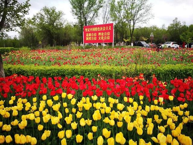 一路向西北行进,20点整,到达了裕民县。安置好住处后,我们驱车绕行小城街道游览街景。天空中细密的雨丝轻柔地亲吻着万物。不一会儿,夕阳的余晖驱散了阴云和细雨。在辽阔的霍日姆德湖对面,聚集了许多观赏郁金香的游人。红的、黄的、紫的花蕊,以各种颜色为基调和造型拼接成“花的田野”。如“画龙点睛”的妙笔为小城着色与添彩。人们的脸上也充溢着如花儿一般的幸福。返回宾馆的路上,仍觉得意犹未尽,睁大眼睛浏览着小城的外景,享受那一份夜色来临的静谧。路边一家名为“妈妈的味道”的面馆让我顿觉一股暖意,催促丈夫停下车,快步走了进去。女店主赶紧拿起擀面杖擀面,很快端上来三碗香气扑鼻的臊子面放在红木餐桌上。
