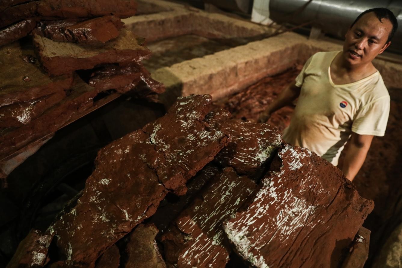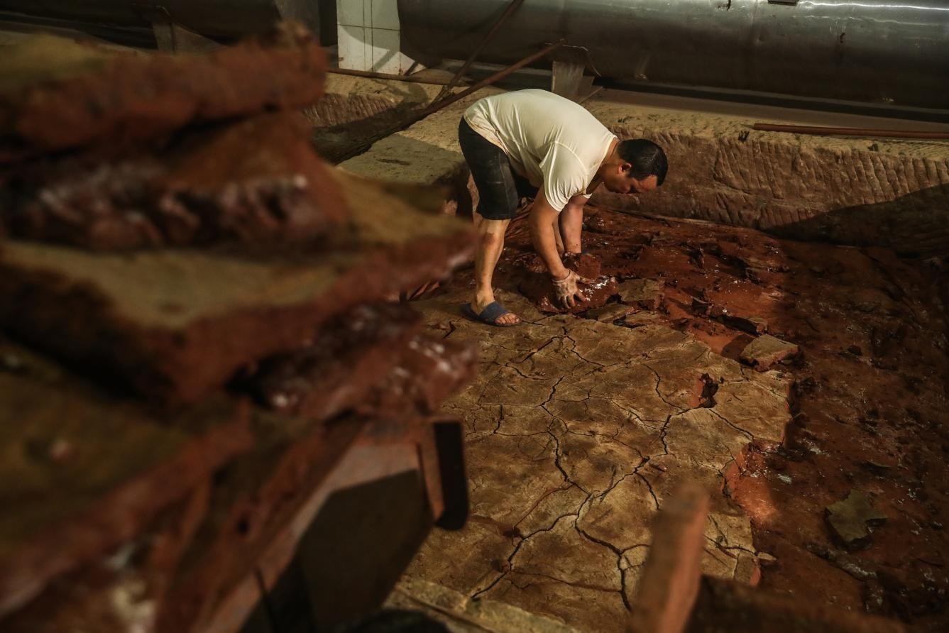 班组的员工已陆续离开,雷登强又开始检查之前封的窖。经过仔细地看、捻、模,他决定对这个一周前封的窖进行“拍杵”,也就是用木锨轻轻拍打,修复微小的裂纹。寂静的晾堂中,不断响起木锨“啪、啪”的声音,不疾不许,时轻时重。这是雷登强们与锨下的“紫红泥”和泥下的酒醅中微小生灵的精神交流。