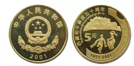 除了金银纪念币之外,2001年中国人民银行发行了庆祝西藏和平解放50周年普通纪念币,纪念币正面主景图案由国徽和五朵牡丹花组成,内缘上方为国名和年号;背面主景图案由布达拉宫、两名藏族男女青年欢庆西藏和平解放50周年舞蹈的场景及面额,内缘左侧环排有“西藏和平解放五十周年”汉藏两种文字。