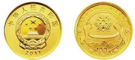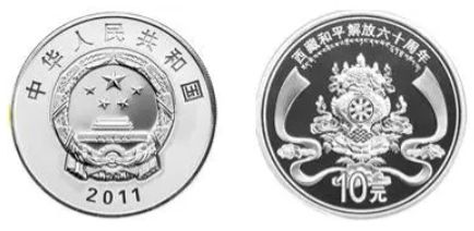 西藏和平解放60周年1/4盎司金质纪念币,背面图案为莲花、哈达及雪山,配以吉祥花草纹样等装饰组合设计,并刊“西藏和平解放六十周年”汉、藏文字样及面额;1盎司银质纪念币背面图案为藏族传统吉祥图八瑞相,配以哈达、祥云等装饰组合设计,并刊“西藏和平解放六十周年”汉、藏文字样及面额。