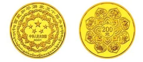 西藏和平解放50周年纪念金币,正面图案为西藏民族纹饰、五星、国名、年号及“西藏和平解放五十周年”汉文字样和“中国西藏和平解放五十周年纪念”藏文字样;背面图案为西藏民族传统“八吉祥”图、莲花装饰图案及面额。