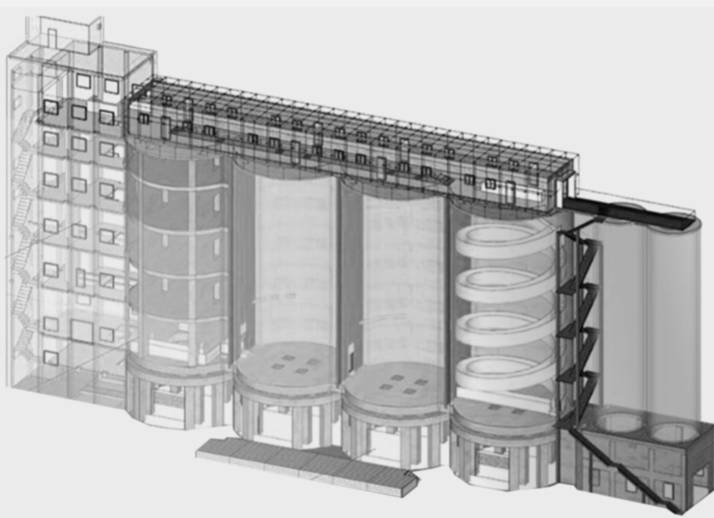 绽放数字艺术馆的建筑物前身是玻璃厂的原料筒仓。该筒仓位于厂区中心,是整个厂区的制高点和标志建筑,平面东西向长77.9米,中间是四个直径14米的钢筋混凝土筒状结构,东侧的长方体建筑曾用于垂直运输原料。建筑物立面从下到上则分为三个部分:底层是高约6米的出料层,中间是高30米的筒仓存储层,最顶上则是高3.6米的入料层。筒仓建筑总面积2468.21㎡,户外广场面积3991㎡。