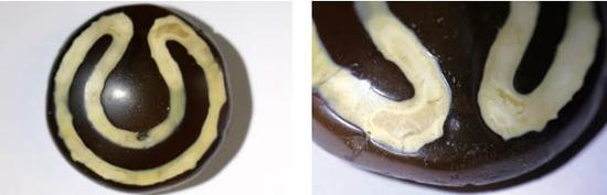 结合前辈学者贝拉西斯和麦凯对在玉髓珠上蚀绘白色花纹的方法等进行的基础考察和研究,本书作者在此基础上合理推导出天珠的制作工艺:天珠的蚀花工艺承袭自蚀花红玉髓珠的工艺技术,工匠先将白玉髓珠体的表层全部染黑,再于其上蚀绘所需的乳白色纹饰,并最终在珠体上呈现出黑色的底和乳白色的花纹,以此达到黑白鲜明的艺术对比效果。