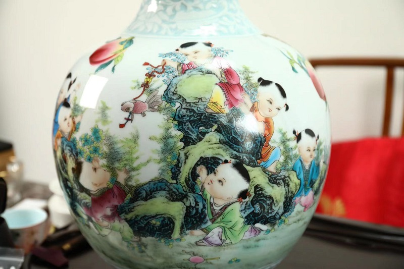 该瓶以天球瓶为造型,以婴戏为题材,采用传统粉彩装饰技法,画面中活泼可爱的儿童形象描绘得惟妙惟肖。既有表达连生贵子之吉祥寓意,又能表现节庆欢乐的气氛,具有祈福求安的内涵,历来深受艺术家青睐。