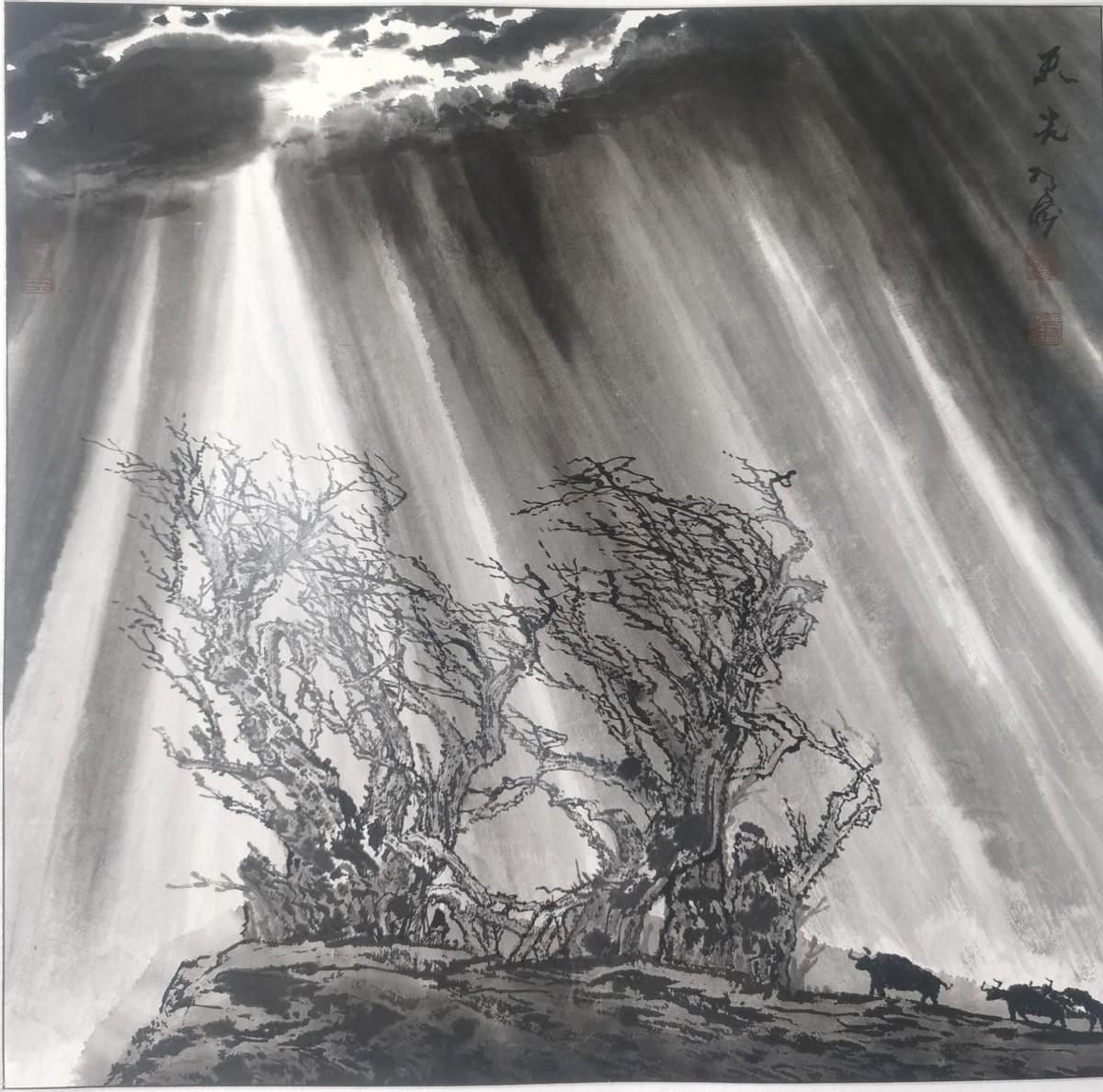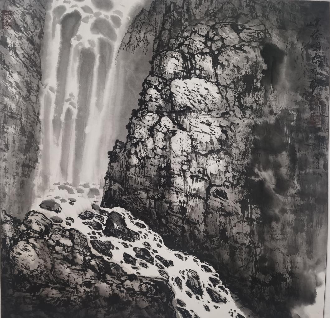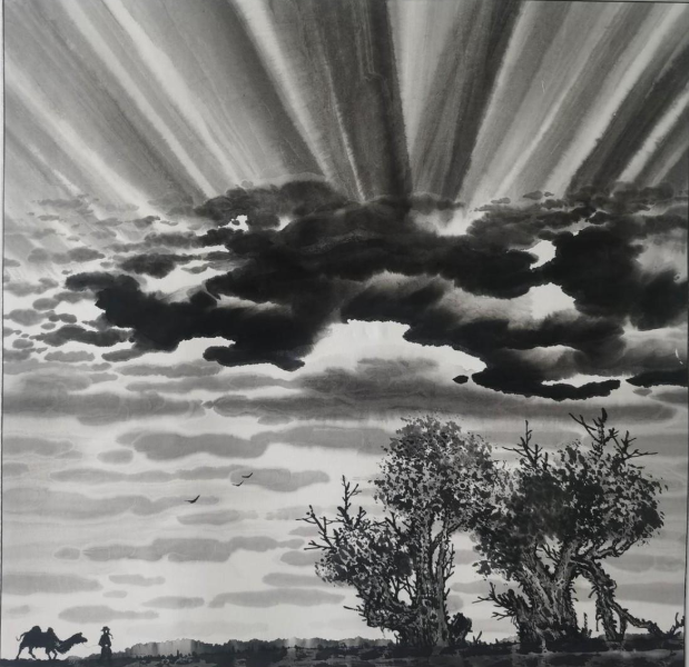 当水墨相融,铺陈于宣纸上时,我们不仅见到了大气清朗、冷傲绵柔的山水冰雪,更见到了坚韧不拔、自强不息的胡杨,不禁让人心驰神往、心旌摇曳。冀有泉笔下的胡杨苍劲、古朴、雄奇、老辣,有着苍茫雄浑、大气磅礴、浪漫瑰丽的气韵,彰显着我泱泱中华坚韧不拔、凌然不屈的胸襟与气魄!