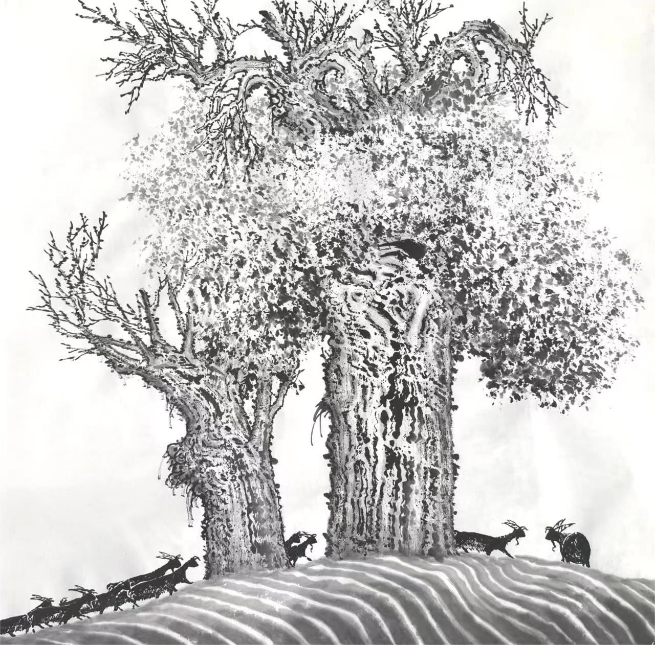 他勇于突破前人窠臼,将中西方艺术形式融会贯通,另辟蹊径,开创出极具个人艺术风格的“驳墨法”、“飞白弹点法”水墨新技法,被业内称之为“冀氏画法”。自此,冀有泉开创了水墨胡杨的先河,成为了当之无愧的“中国水墨胡杨第一人”。