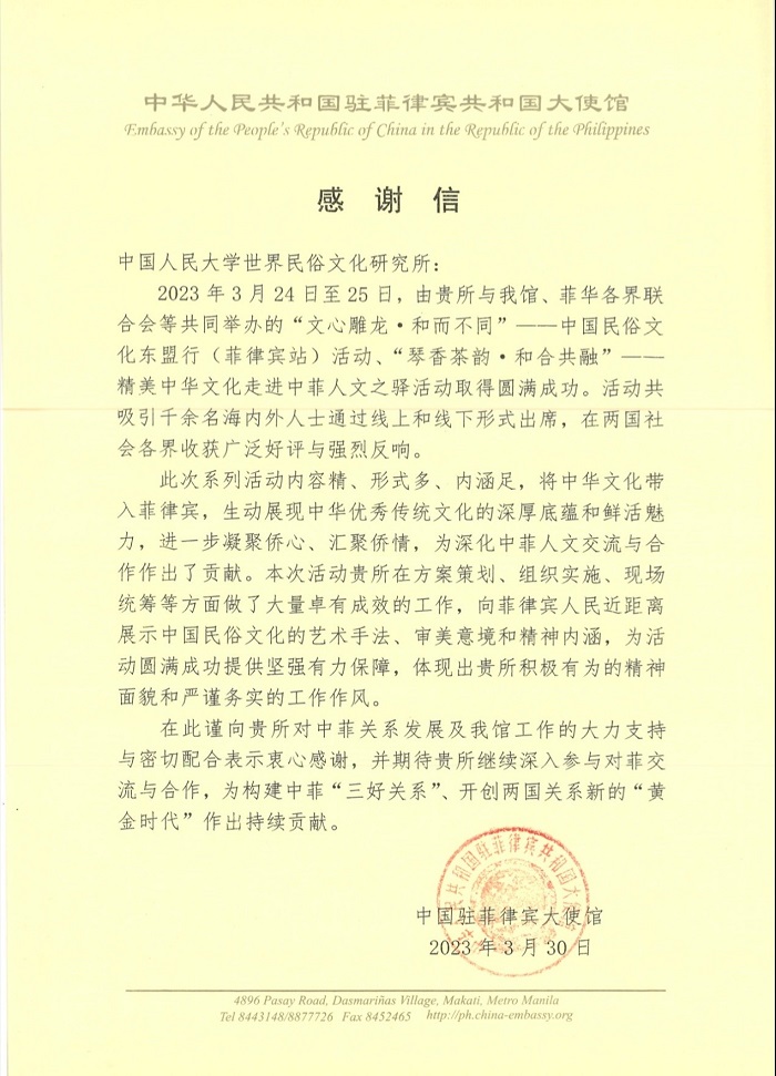 2023年3月24日,中国驻菲律宾使馆、菲律宾远东大学、中国人民大学世界民俗文化研究所、国际儒学联合会等共同举办“文心雕龙·和而不同”——中国民俗文化东盟行(菲律宾站)活动。中国驻菲律宾大使黄溪连致视频贺辞,使馆公参王玉磊、文化参赞李薇、教育参赞熊胜,中国人民大学世界民俗文化研究所所长遂岩、国际儒学联合会副秘书长徐永吉、菲华各界联合会主席杨华鸿、雅典耀大学孔子学院院长梁广寒,远东大学艺术和科学院院长雷耶斯、艺术中心主任洛佩兹以及中菲文化领域专家、学者和大学生逾300人出席活动。