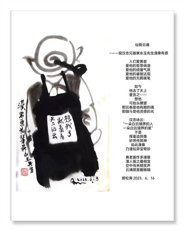 这几天书画界、漫画界惋惜和谈论的都是湘籍著名画家黄永玉的逝世和张汉忠给黄永玉画的漫画像,笔者问起张汉忠如何会为逝世的黄永玉画漫画?张汉忠说:“一是、他敬佩黄永玉老先生的洒脱,二是、看到生黄永玉先生曾在他的遗嘱里表示:“我希望我的骨灰作为肥料,回到大自然去,想我的时候,看看天,看看云。”觉得黄永玉老生生风骨超越了凡人思维!著名漫画家居松涛是大庆美协副主席、黑龙江漫委会付主任、画评人,他看了张汉忠给逝世黄永玉老先生画的漫画给了极高的评论。(阎肃)