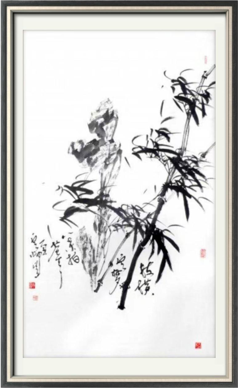 从竹根画起,画至稍芒,雄起的粗枝与飘动的细枝相映成趣,在空间上达成了刚柔相济的审美意象,视觉观感丰富多彩。大枝独立现精神,一簇迎风显气韵,动中有静,静中有动,竹画既可以仰观宇宙之大,也可以附察万类之盛,不但有骨有筋,并且有血有肉,有气有神!