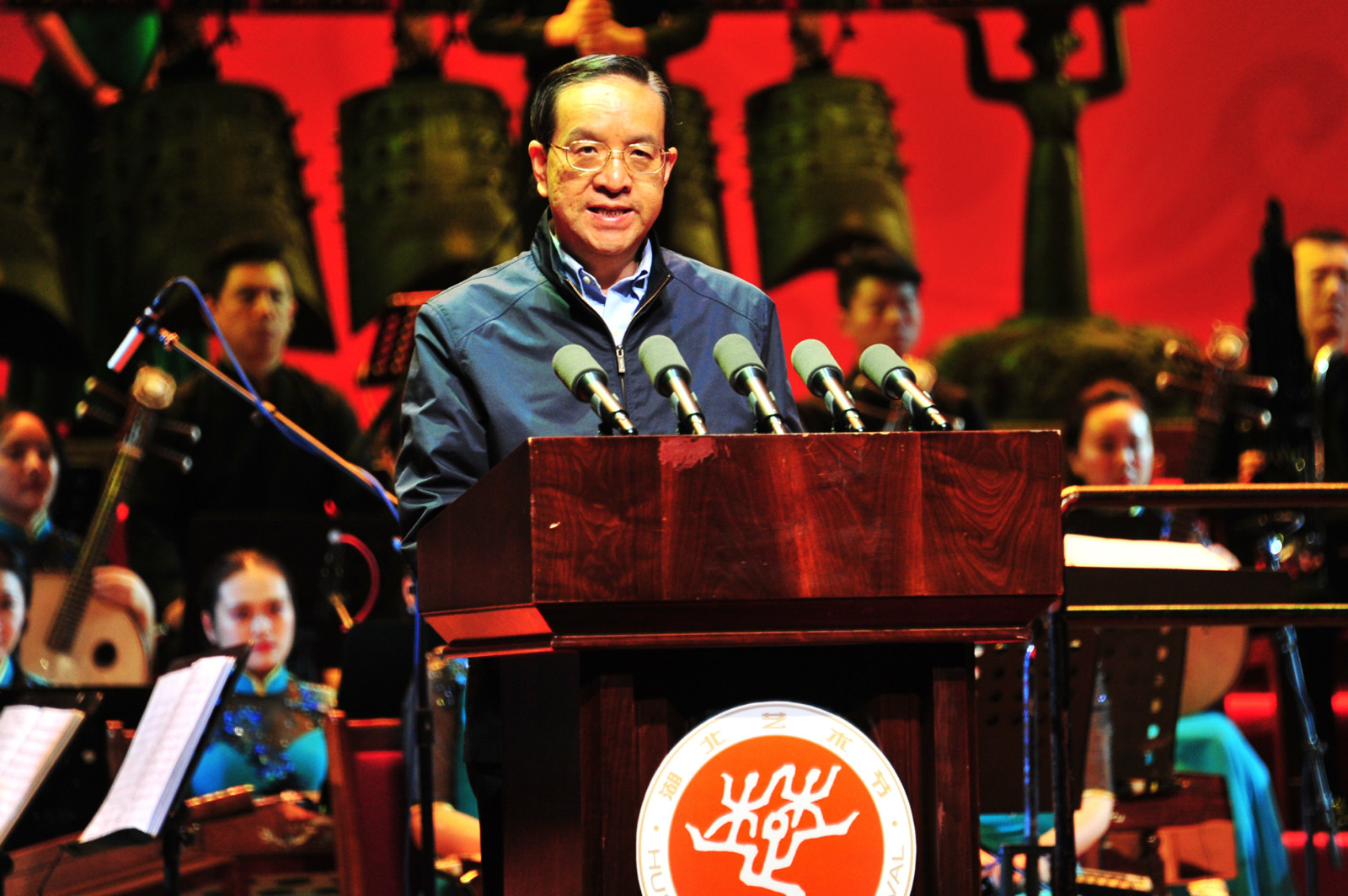 10月19日晚,第三届湖北艺术节暨庆祝改革开放40周年优秀作品展演开幕式在洪山礼堂举行。省委书记、省人大常委会主任蒋超良出席开幕式并宣布开幕。省委副书记、省长王晓东致辞。开幕式由副省长陈安丽主持。开幕式后,省政协主席徐立全,省领导王玲、郭跃进,武汉市市长周先旺,省政府秘书长别必雄等领导在厅党组书记、厅长雷文洁,厅党组成员副厅长严荣利、李耀华、段天玲、陶宏家的陪同下和省直单位负责人、机关干部、企业职工、社区居民、高校学生代表等千余名观众一起观看了编钟与大型民族管弦乐音乐会。千年编钟与民族管弦乐,奏响了发展前行的新时代强音,表达了建设文化强省的不懈追求。
