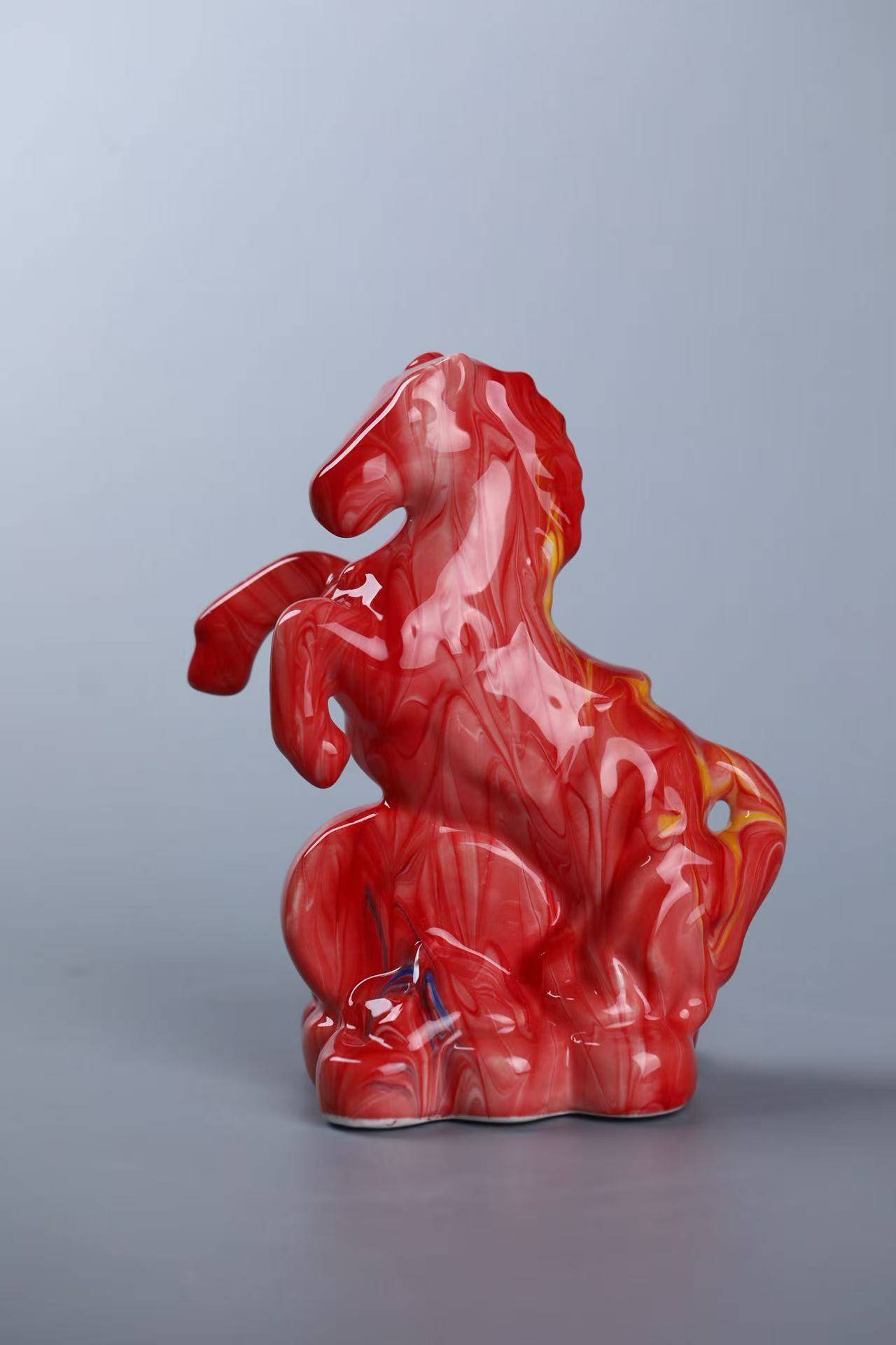 作品以“五行”为魂,远不止于色彩对应。五行相生相克、循环不息的思想,通过釉色的交织流动得以视觉化呈现,诠释了万物关联、动态平衡的宇宙观。骏马腾跃于这五行流霞之中,仿佛驰骋于天地能量之间,是力量与自然韵律的共鸣。整体作品超越了单纯的工艺展示,成为一首“泥与火”铸就的视觉哲学诗,深刻表达了“天人合一”的传统智慧与对自然伟力的礼赞。