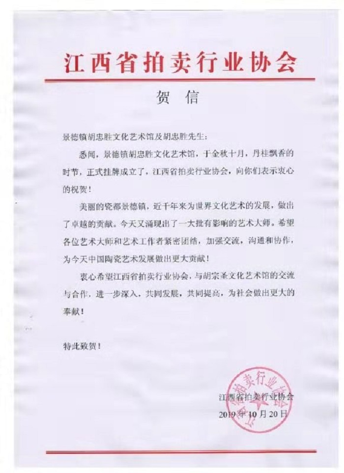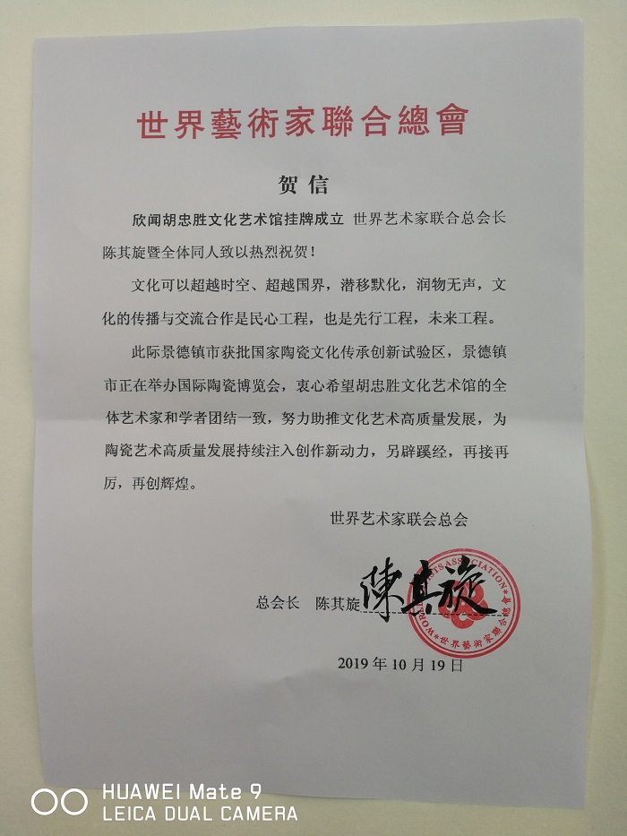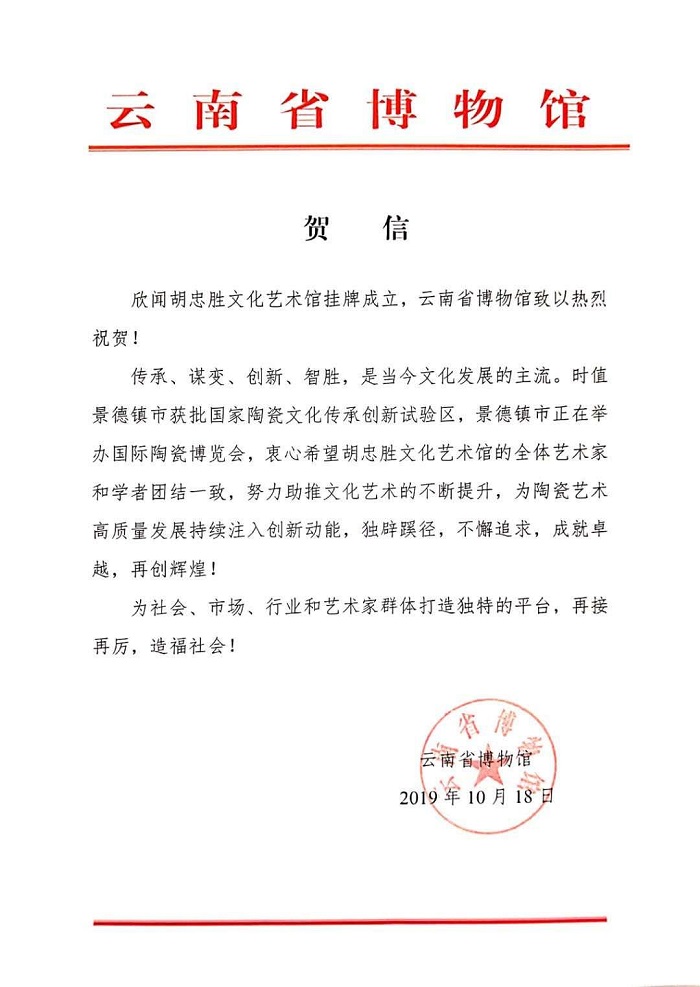 瓷博会期间,胡忠胜文化艺术馆将挂牌成立,世界艺术家联合会、江西省拍卖行业协会、云南省博物馆发来贺信,贺信中寄予了文博界的厚望,希望以成立胡忠胜文化艺术馆为契机,为陶瓷艺术高质量发展持续注入创新动力,另辟蹊径、再接再厉、再创辉煌。